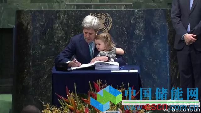 溫馨一刻:美國(guó)國(guó)務(wù)卿克里抱著自己的孫女上臺(tái),代表美國(guó)在《巴黎協(xié)定》上簽字。(來(lái)自@聯(lián)合國(guó) 官方微博)