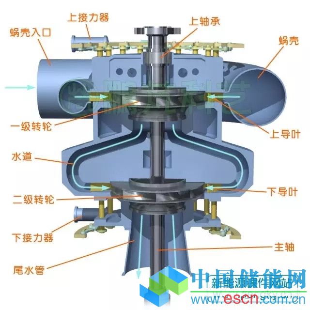 兩個(gè)轉(zhuǎn)輪共用一根轉(zhuǎn)軸,轉(zhuǎn)軸下端安裝在推力軸承上,推力軸承承擔(dān)轉(zhuǎn)輪的重量與水的推力,轉(zhuǎn)軸上端有導(dǎo)軸承,防止轉(zhuǎn)軸晃動(dòng)。每個(gè)轉(zhuǎn)輪有一套導(dǎo)水系統(tǒng),由各自的接力器驅(qū)動(dòng)。