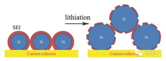 圖3.Si顆粒鋰化后發(fā)生體積膨脹、SEI膜破裂、材料脫離集流體
