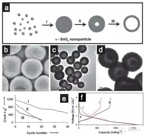 圖5(a)SnO2空心球形成示意圖:通過從內(nèi)到外的奧斯瓦爾德熟化(b)和(c)SnO2是空心球(d)a-Fe2O3@SnO2鈴鐺狀(e)循環(huán)圖(f)空心球的第一圈的充放電曲線