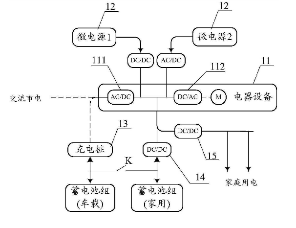 本發(fā)明實施例公開了一種直流微電網(wǎng)結(jié)構(gòu),利用電器設(shè)備的變頻器開放的直流母線,直接接入光伏等分布式電源,直流微電網(wǎng)可以直接通過電器設(shè)備的機載變頻器接入市電電網(wǎng),從而直流微電網(wǎng)不需要額外的DC/AC轉(zhuǎn)換器就可以與市電并網(wǎng),與傳統(tǒng)的直流微電網(wǎng)結(jié)構(gòu)相比,節(jié)省并網(wǎng)逆變裝置。而且,電器設(shè)備、充電樁和雙向DC/DC這三個節(jié)點可以組成環(huán)狀網(wǎng)絡(luò),每個節(jié)點都有兩個供電點,如遇一側(cè)線路故障檢修等,另一側(cè)還可以繼續(xù)為節(jié)點送電,與傳統(tǒng)的直流微電網(wǎng)的結(jié)構(gòu)相比,具有更高的供電可靠性。