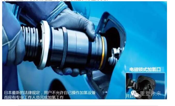 加氣槍連接到車的加氣口后被電磁機(jī)構(gòu)鎖住,安全性和電動車充電接頭的水平相當(dāng)。同時加氣槍具有單向閥的功能,在加氣頭出現(xiàn)損壞情況下,防止氣體向外泄漏并提高加氣頭的使用壽命。管路電磁閥,在給氣瓶充氣時,可有效防止氣體進(jìn)入電池。值得一提的是,日本最新法律規(guī)定,用戶不允許自己操作加氫設(shè)備,而應(yīng)由專業(yè)工作人員完成加氫工作,也是出于防止事故發(fā)生的考慮。