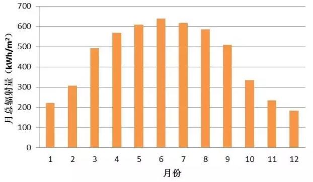 該地區(qū)近20年太陽能月總輻射量變化如下圖所示。5~8月太陽能輻射量較大,11~1月太陽能輻射量較小。