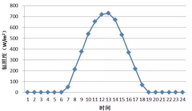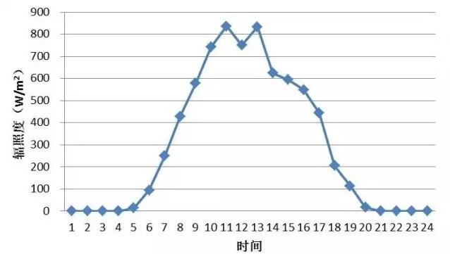 對距離風(fēng)電場最近的輻射觀測站四個典型日的輻射日變化進(jìn)行分析,該站2014年春分、夏至、秋分、冬至四個典型日輻照度日變化見下圖。除秋分日受陰雨天氣影響外,其余三個典型日輻照在12:00~13:00出現(xiàn)全天最大值,主要集中在10:00~15:00,占全天的60%以上(夏至),冬至日達(dá)90%以上。