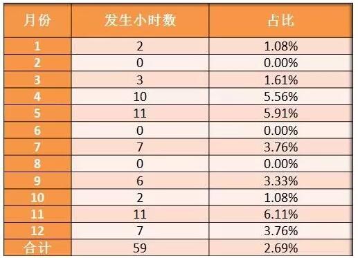 該風(fēng)電場2014年各月最大出力發(fā)生的時間為:1月、2月、5月、12月發(fā)生在19:00,3月發(fā)生在20:00,4月、9月發(fā)生在12:00,6月、11月發(fā)生在17:00,7月發(fā)生在23:00,8月發(fā)生在6:00,10月發(fā)生在1:00,即除4月、9月,其他各月最大出力均發(fā)生在光伏電站不發(fā)電或者發(fā)電很少的時間。