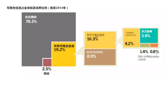 報告顯示,可再生能源裝機量在2015年創(chuàng)下新紀錄。新增可再生能源發(fā)電裝機容量約147GW,為歷年最高。同時,現(xiàn)代可再生能源熱容量保持增長態(tài)勢,可再生能源在交通領域的應用也在擴大。分布式可再生能源的快速進步正在縮短能源富有群體和能源短缺群體之間的差距。報告還公布了可再生能源占全球生產(chǎn)、消費總量的比例: