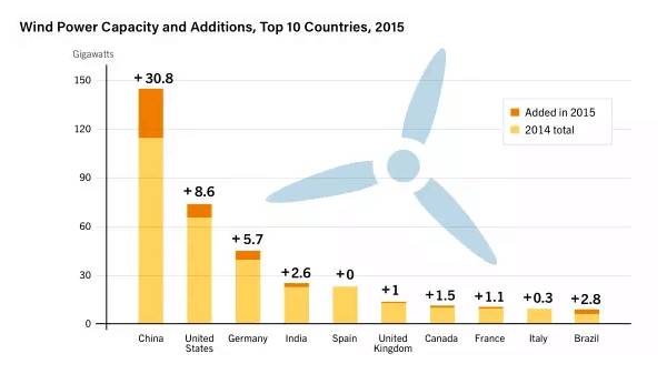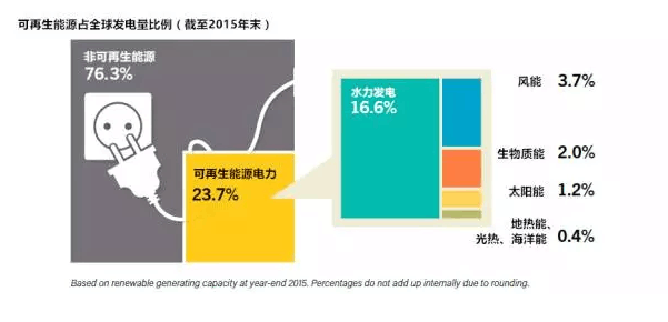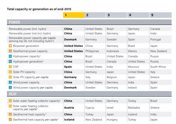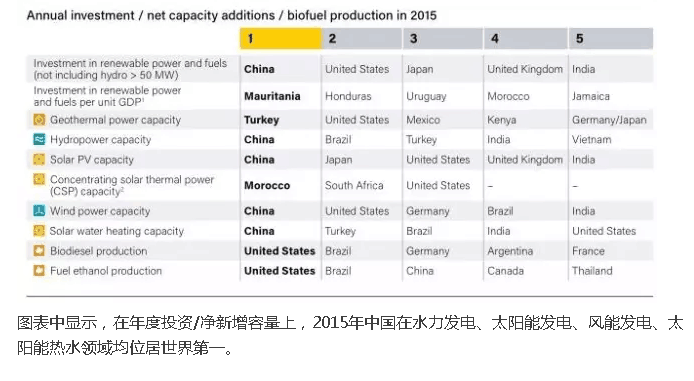 在總發(fā)電量方面,截至2015年末,中國在水力發(fā)電、水力容量、太陽能容量、風能容量、太陽能熱水容量、地熱能容量上均位居世界第一。