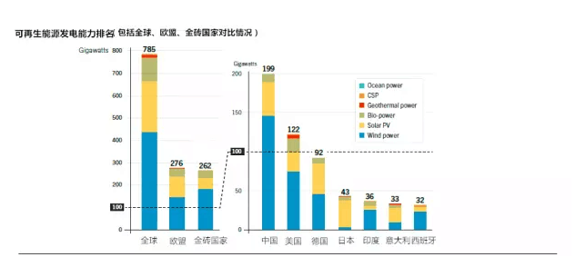 報告將各國全球可再生能源發(fā)電容量進行了排名,其中中國以199GW排名第一,美國、德國分別以122GW、92GW位居第二和第三。
