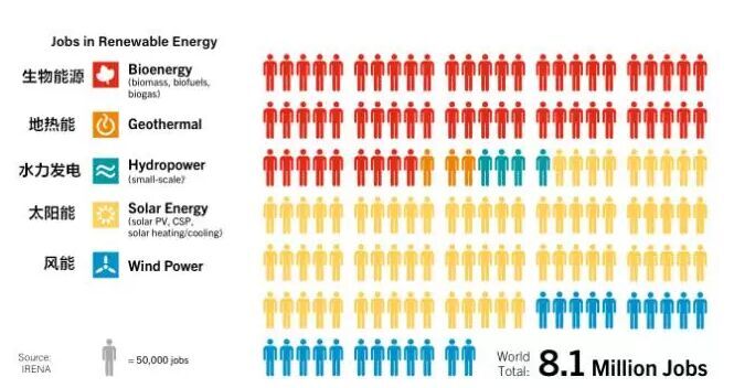 報告指出,與投資增長隨之而來的是技術進步、成本下降,和更多的就業(yè)崗位。當前,共有810萬人工作在可再生能源領域——可再生能源行業(yè)穩(wěn)定增長的就業(yè)率同整體能源行業(yè)勞動力市場的蕭條形成了鮮明對比。