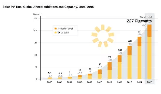 ↓↓↓2005年~2015年全球太陽能新增和總容量數(shù)據(jù)↓↓↓