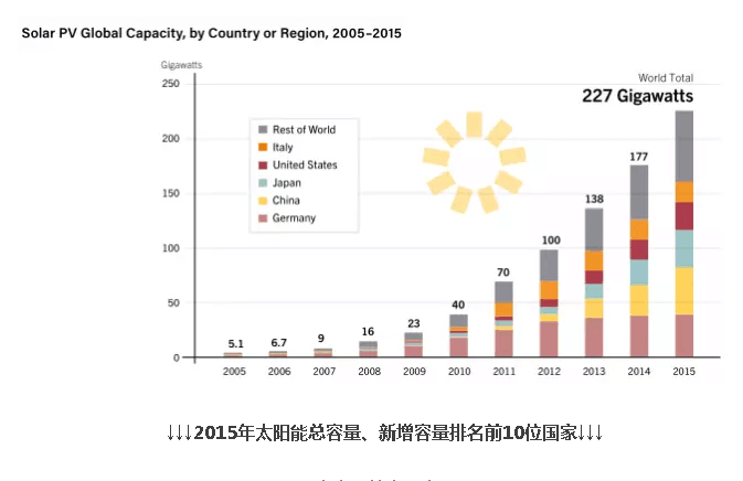 ↓↓↓2005年~2015年各主要國家/地區(qū)太陽能容量增長分布情況↓↓↓