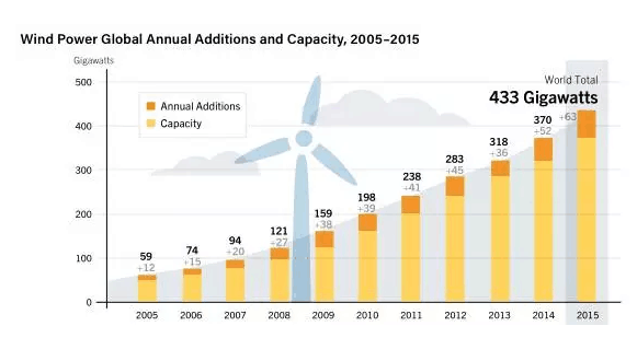 ↓↓↓2005~2015年全球風能容量、新增容量↓↓↓