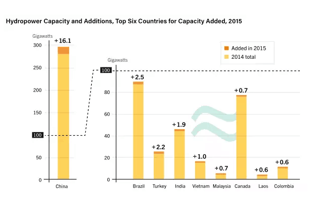 ↓↓↓2014年水力發(fā)電總容量和2015年新增容量前六位國家↓↓↓