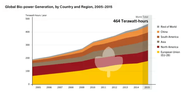 4、截至2015年生物質(zhì)能發(fā)電總量為464萬億瓦時