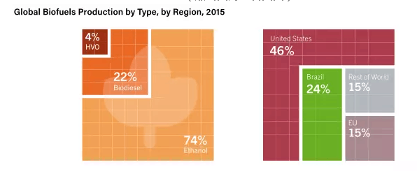 ↓↓↓2015年按類型、地區(qū)排列全球生物燃料生產(chǎn)情況↓↓↓