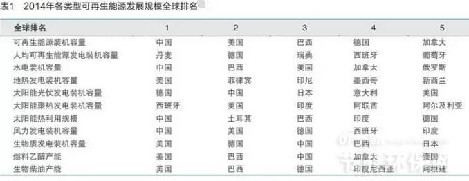 中國(guó)在發(fā)展可再生能源的道路上已邁出實(shí)質(zhì)性步伐,2014年中國(guó)可再生能源發(fā)電總裝機(jī)容量以及水電和風(fēng)電裝機(jī)容量均排名全球第一,太陽(yáng)能光伏發(fā)電裝機(jī)容量排名第二,生物質(zhì)發(fā)電裝機(jī)容量和燃料乙醇產(chǎn)能均排名第三(見(jiàn)表1)。
