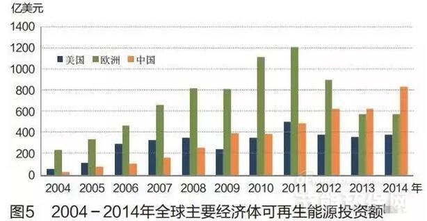 近年來(lái)中國(guó)的可再生能源投資高速增長(zhǎng),從2013年起超越歐洲和美國(guó)(見(jiàn)圖5),2014年占全球發(fā)展中國(guó)家可再生能源新增投資的2/3。