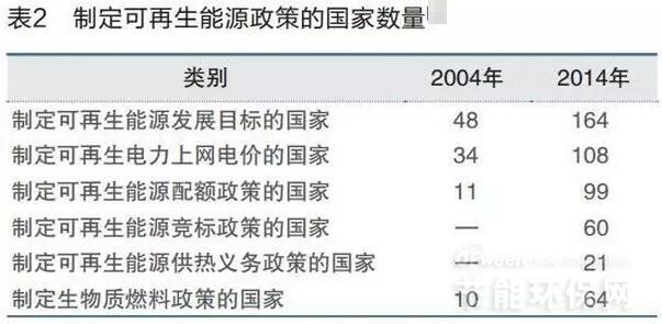可再生能源的發(fā)展很大程度上受到政府政策的影響。在過(guò)去的十年中,制定并執(zhí)行可再生能源支持政策的國(guó)家和地區(qū)數(shù)量迅速增長(zhǎng)(見(jiàn)表2)。截至2014年底,已有164個(gè)國(guó)家確定了可再生能源發(fā)展目標(biāo),145個(gè)國(guó)家頒布了相應(yīng)的支持政策。