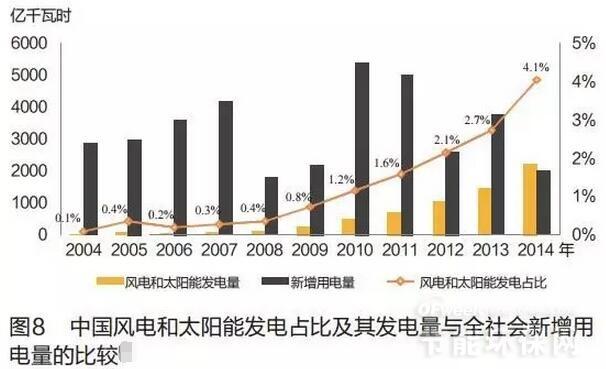 為了探討可再生能源在支撐中國(guó)能源消費(fèi)中的作用,需要計(jì)算可再生能源發(fā)電占全部發(fā)電量的比例,并將可再生能源發(fā)電量與每年新增電力需求做比較。中國(guó)風(fēng)電和太陽(yáng)能發(fā)電占比從2004年的0.1%增長(zhǎng)到2014年的4.1%,增速顯著。
