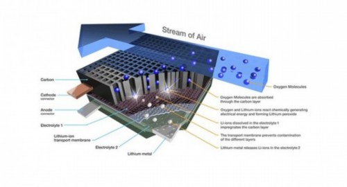 電池500技術(shù)是一個(gè)可循環(huán)系統(tǒng),采用普通空氣作為化學(xué)試劑,充電時(shí),可以把氧氣重新釋放到環(huán)境中,也因此IBM又稱這款電池為“空氣呼吸電池”。
