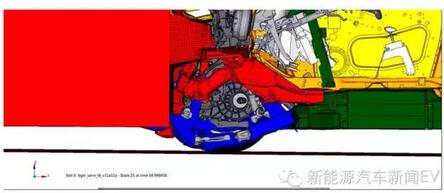 從圖片上可以看出,正面碰撞時車架接凹進去了,而電池包模組部分(綠色部分)沒有任何的變形。