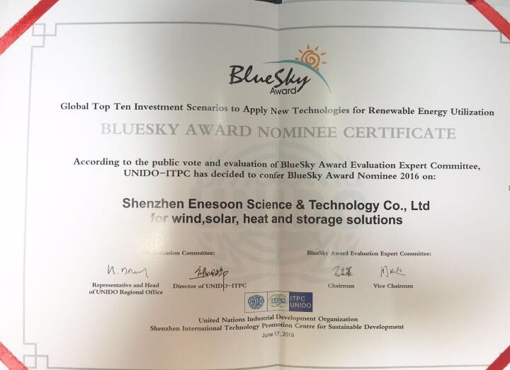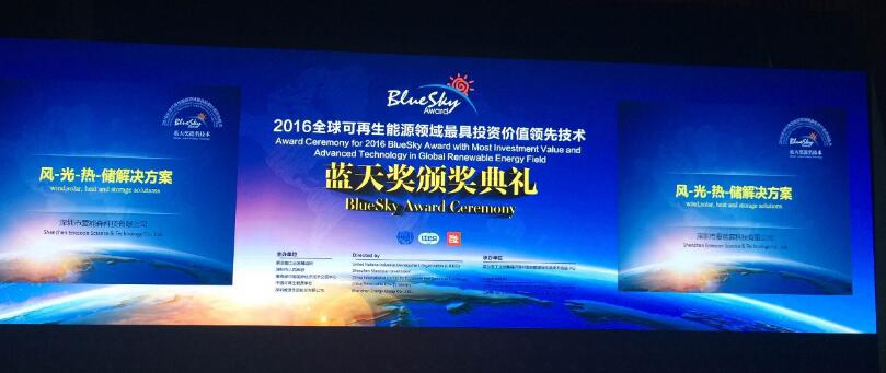 中國儲(chǔ)能網(wǎng)訊:經(jīng)過初審、復(fù)審和多輪現(xiàn)場答辯陳述等嚴(yán)格評(píng)選,2016年度全球可再生能源領(lǐng)域最具投資價(jià)值的領(lǐng)先技術(shù)藍(lán)天獎(jiǎng)終于塵埃落定。深圳愛能森“風(fēng)-光-熱-儲(chǔ)解決方案”項(xiàng)目在眾多申報(bào)技術(shù)中脫穎而出,成為全球20項(xiàng)入圍藍(lán)天獎(jiǎng)候選技術(shù)之一,并獲得2016年度“全球可再生能源領(lǐng)域最具投資價(jià)值的領(lǐng)先技術(shù)藍(lán)天獎(jiǎng)提名獎(jiǎng)”。這是藍(lán)天獎(jiǎng)首次接受以可再生能源解決方案形式進(jìn)行申報(bào),說明可再生能源從核心技術(shù),核心產(chǎn)品擴(kuò)充到可再生能源解決方案的重要性。