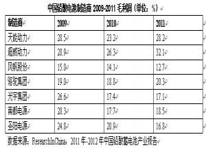 中國鉛酸電池制造商2009-2011毛利潤(單位:%)