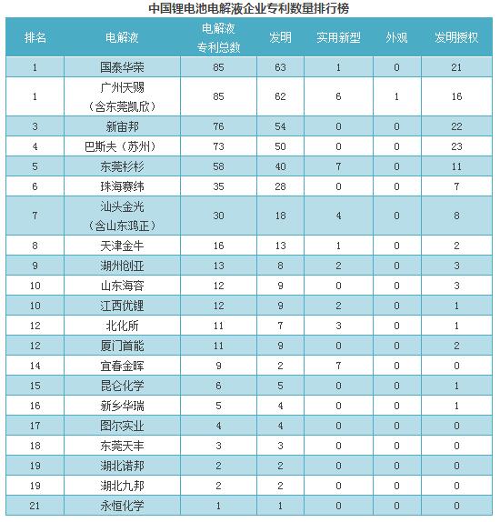 原標(biāo)題:中國(guó)鋰電池電解液專利技術(shù)排行榜
