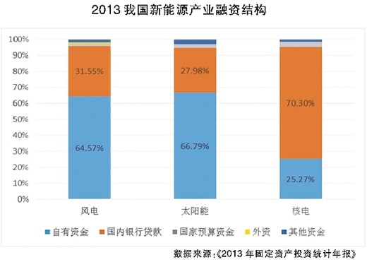 首先,融資方式較少。從融資渠道來(lái)看,新能源項(xiàng)目資金主要來(lái)源于企業(yè)自有資金和國(guó)內(nèi)貸款。2013年,自有資金和國(guó)內(nèi)貸款在風(fēng)電、太陽(yáng)能、核電項(xiàng)目融資結(jié)構(gòu)中的比例分別達(dá)到96.11%、94.77%和95.57%。由于新能源企業(yè)上市門(mén)檻較高以及我國(guó)債券市場(chǎng)發(fā)展相對(duì)滯后,直接融資僅占資金來(lái)源的10%左右。而多數(shù)風(fēng)險(xiǎn)投資機(jī)構(gòu)對(duì)新能源項(xiàng)目的投資尚處于探索階段,投資規(guī)模較小。從融資工具來(lái)看,國(guó)內(nèi)金融結(jié)構(gòu)匹配新能源產(chǎn)業(yè)的融資產(chǎn)品體系較不完善,新型抵押擔(dān)保、信托、可轉(zhuǎn)債、互聯(lián)網(wǎng)融資等創(chuàng)新融資工具應(yīng)用較少。