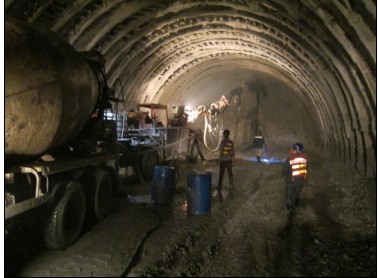 1#尾水主洞于2011年1月29日實(shí)施主洞洞挖施工以來(lái),采取了三項(xiàng)措施保證施工。第一精心組織,組建了一支業(yè)務(wù)水平高的專業(yè)技術(shù)指導(dǎo)小組,負(fù)責(zé)深入現(xiàn)場(chǎng),了解施工進(jìn)度,及時(shí)解決施工過(guò)程中出現(xiàn)的技術(shù)難題,根據(jù)現(xiàn)場(chǎng)施工情況變化,隨時(shí)調(diào)整施工方案;第二科學(xué)施工,采用先進(jìn)的TRT6000型地質(zhì)雷達(dá)系統(tǒng)進(jìn)行中長(zhǎng)距離的地質(zhì)預(yù)報(bào),指導(dǎo)洞室安全掘進(jìn);采用納米鋼纖維及納米仿鋼纖維噴射混凝土技術(shù)及時(shí)對(duì)塌方及滲漏水部位進(jìn)行了封閉,從而保證了洞室安全;采用短進(jìn)尺、弱爆破、預(yù)留核心土全斷面一次爆破和每開(kāi)挖10~20m及時(shí)進(jìn)行底板部位的混凝土置換工作方法,全面保證正常施工;第三人文關(guān)懷,制定了錨噴支護(hù)等獎(jiǎng)勵(lì)機(jī)制,并實(shí)行“八項(xiàng)承諾心系農(nóng)民工”舉措,在能力范圍內(nèi)為工程施工全方位創(chuàng)造條件,有效激發(fā)了施工隊(duì)伍的積極性,有利地促進(jìn)了工程的進(jìn)度。