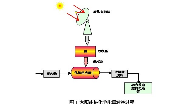 什么是太陽(yáng)能熱化學(xué)發(fā)電?圖1是太陽(yáng)能熱化學(xué)能量轉(zhuǎn)換過程示意圖。分散的太陽(yáng)能被聚集,然后通過相應(yīng)的吸收器接收,轉(zhuǎn)化為太陽(yáng)能熱能。太陽(yáng)熱能以反應(yīng)熱的形式驅(qū)動(dòng)吸熱的化學(xué)反應(yīng),從而將太陽(yáng)熱能轉(zhuǎn)換到燃料化學(xué)能中去。太陽(yáng)能熱化學(xué)發(fā)電技術(shù)就是利用該過程的新型太陽(yáng)能與化石能源互補(bǔ)利用模式。