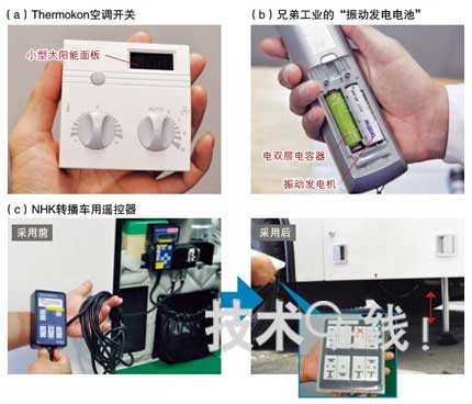 圖2 因無電池便利性提高 要點為:不需要一次性電池的更換與配線(a) 。組合電容與發(fā)電機的“振動發(fā)電電池”(b) 。與干電池的尺寸與形狀相同,可以直接在遙控器上使用。NHK富山電視臺與湯淺工機共同開發(fā)了轉(zhuǎn)播車千斤頂遙控器試制品(c) ,用手指按鈕的力量來發(fā)電。 |