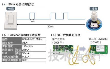 圖4 主攻低功耗及易用性的EnOcean 30ms間信號只傳送3次的簡單方式(a) 。 待機電流低到只有0.2μA(b) 。所使用的頻帶會依國家與地區(qū)而變。因模塊化易用性提高(c) 。 |