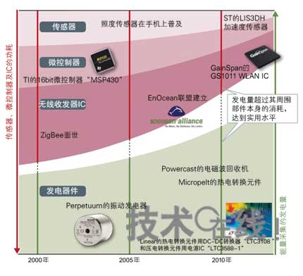 圖3 發(fā)電量超過本身的消耗 在發(fā)電器件性能提高的同時,其周邊部件的耗電量正穩(wěn)步下降。尤其在在耗電量最大的無線收發(fā)IC領(lǐng)域,擁有很高技術(shù)實力的風險企業(yè)的面世具有重要意義。 |