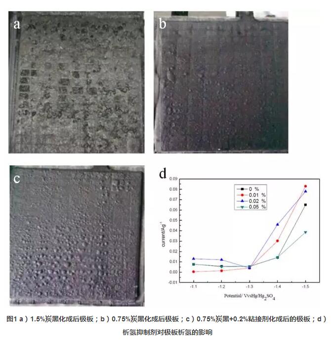 結(jié)果顯示,對(duì)于添加量在1.5%以上的碳材料,在不添加粘接劑和抑制劑的情況下,極板鉛膏按常規(guī)工藝化成后幾乎完全脫落(圖1a),證實(shí)了高含量的碳對(duì)極板活性物質(zhì)結(jié)構(gòu)和性能影響很大。當(dāng)降低碳的含量或加入合適的粘接劑后,極板化成后情況明顯好轉(zhuǎn)(圖1b與圖1c),但仍然不能徹底解決。在電解液中加入析氫抑制劑,從圖1d中可以看出,析氫抑制劑在0.02%以后對(duì)析氫有促進(jìn)作用,含量在0.05%時(shí)有明顯的抑制效果,但在化成時(shí)負(fù)極起泡明顯,不能單獨(dú)使用,必須同時(shí)使用相應(yīng)的消泡劑。
