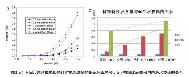 隨后,測(cè)試了碳含量在0.2-2%的電化學(xué)與電池性能,電化學(xué)測(cè)試表明(圖2a),隨著碳含量的增加,極板的析氫電位與電流逐漸增加。當(dāng)碳含量增加到1%后,析氫電位與電流急劇增加。圖2b說(shuō)明了碳材料比表面積會(huì)影響電池的水損耗性能,而與碳材料的類型并無(wú)直接關(guān)系。在相同的含量下,比表面積大的碳材料具有較高的析氫電位,增加了電池的水損耗值。