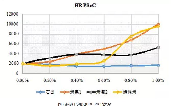 選取幾種不同類型的碳材料(石墨、炭黑、活性炭等),測(cè)試了這幾種碳在添加量為0.2%—4%之間,以及析氫抑制劑、粘接劑對(duì)負(fù)極板的影響。并且選用常規(guī)正極板,組裝成單體電池,測(cè)試了碳對(duì)電池水損耗與HRPSoC的影響。