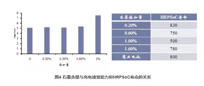 石墨是由六角形網(wǎng)格規(guī)則堆積形成的層狀晶體,具有高度有序的結(jié)構(gòu)。測(cè)試了0.2-0.6%添加量下的充電接受能力,在低的添加量下,石墨對(duì)電池的充電接受能力幾乎沒(méi)有影響(圖4),當(dāng)添加量增加到1%以后,才能凸顯石墨在充電接受性能方面的優(yōu)勢(shì)。這與石墨與鉛的親和力很弱有關(guān),即使它相對(duì)其他兩類碳材料具有最佳的導(dǎo)電性,但是由于親和力較弱,在低含量時(shí)反而在活性物質(zhì)中不利于形成良好的導(dǎo)電網(wǎng)絡(luò)。在高含量時(shí)彌補(bǔ)了親和力弱的不足,但是>1%的添加量如前面所說(shuō),會(huì)大幅增加電池的水損耗,不利于深循環(huán)壽命。從圖4中還可以看出石墨對(duì)HRPSoC壽命(加速測(cè)試方案)并無(wú)積極影響,隨著石墨含量的升高,循環(huán)壽命反而降低,這可能是由于含量的增加加劇了電極的極化,使電池過(guò)早失效。在1.6%時(shí)有所增高是由于高含量的石墨增加了電池的充電接受能力。