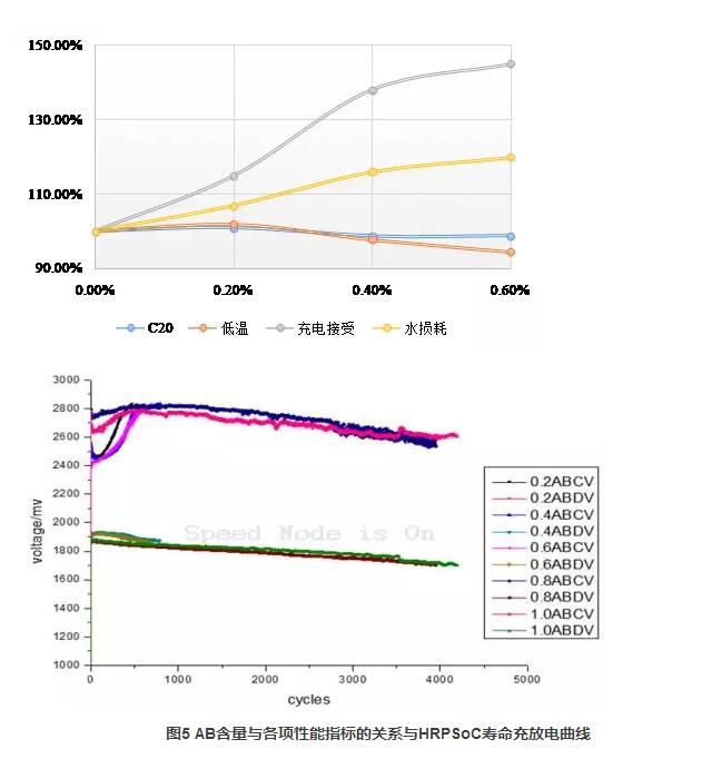 炭黑是由烴類化合物(煤、天然氣、重油等)在氧氣不足的條件下不完全燃 燒或熱裂解而生成的。我們選取了比表面積為50-100的炭黑和比表面積為100-300的炭黑開(kāi)展了電池性能測(cè)試。圖5顯示了AB炭黑對(duì)于電池各種性能的影響與HRPSoC壽命(加速測(cè)試方案)充放電曲線,從圖中可以看出隨著添加量的增加,容量基本沒(méi)有變化,低溫整體趨勢(shì)是逐漸降低,而充電接受能力、HRPSoC壽命與水損耗值逐漸增加。由于充電接受能力的增加,有利于電池HRPSoC壽命。從左邊的圖中可以看出,隨著AB含量的增加,HRPSoC壽命增加,失效模式由充電電壓達(dá)到上限轉(zhuǎn)化為放電電壓低于下限要求,結(jié)合右邊圖中充電接受能力的變化曲線,可以解釋為含量增加后電池充電接收能力有所下降,導(dǎo)致電池荷電狀態(tài)持續(xù)下降,容量衰減導(dǎo)致了放電電壓達(dá)到下限。