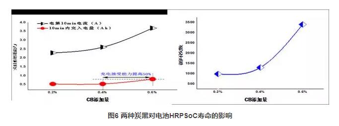 圖6顯示了CB炭黑對(duì)電池充電接受能力與HRPSoC壽命的影響。對(duì)于CB炭黑,隨著含量的增加,充電接受能力與HRPSoC壽命(加速測(cè)試方案)逐漸增加,在0.6%達(dá)到最大3500次,這與它的充電接受能力變化有關(guān),在測(cè)試的過(guò)程中,0.6%添加量下充電接受能力為最大值。從這些結(jié)果可以看出,充電接受能力影響了HRPSoC壽命與其失效模式。