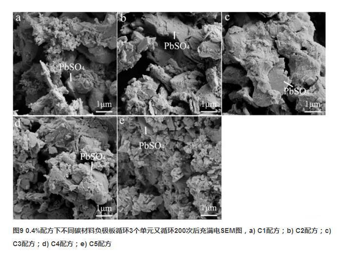 圖9 0.4%配方下不同碳材料負(fù)極板循環(huán)3個(gè)單元又循環(huán)200次后充滿(mǎn)電SEM圖,a) C1配方;b) C2配方;c) C3配方;d) C4配方;e) C5配方