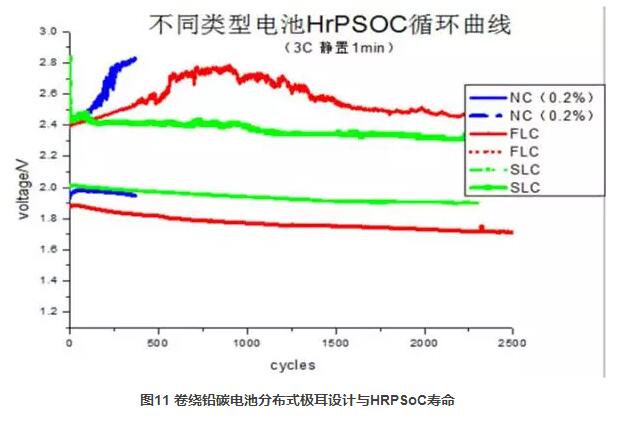 在高碳的應(yīng)用主要體現(xiàn)在80倍率卷繞電池中,基于多年鉛碳電池配方的研究基礎(chǔ),選用了獨(dú)特的碳添加劑與最優(yōu)的添加量,能夠最大程度地提高電池的充電接受能力與循環(huán)壽命,有效避免負(fù)極表面發(fā)脬、疏松。如圖12,這款80倍率卷繞電池在結(jié)構(gòu)設(shè)計(jì)上,采用分布式板耳與TMF超薄極板技術(shù),對(duì)于部分客戶(hù)采用全板耳的結(jié)構(gòu)設(shè)計(jì),使電流的輸出分配更加合理,并且增加了極板的反應(yīng)面積。普通電池(編號(hào)NC)的HRPSoC壽命充電電壓很快達(dá)到上限,普通的鉛碳電池(編號(hào)FLC)壽命在普通電池的基礎(chǔ)上提高了4-5倍,但是由于充電接受能力不夠理想達(dá)到了電壓下限,而優(yōu)化設(shè)計(jì)后的卷繞鉛碳電池(編號(hào)SLC)在普通鉛碳電池壽命結(jié)束終止時(shí)電壓仍在1.9V以上。
