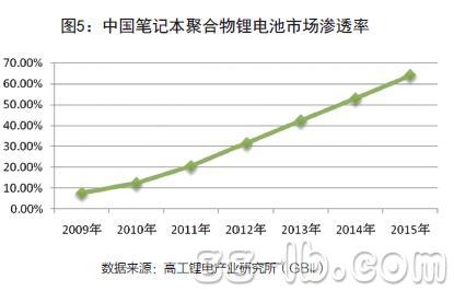 據(jù)高工鋰電產(chǎn)業(yè)研究所(GBII)統(tǒng)計(jì),2009年全球筆記本電池采用聚合物電池的比例僅為7.6%。到2012年,聚合物鋰離子電池在筆記本電腦中的滲透率已經(jīng)達(dá)到了31.5%。預(yù)計(jì),聚合物鋰離子電池的市場(chǎng)滲透率在2015年將達(dá)到64%。(圖5)聚合物鋰離子電池作為未來(lái)幾年數(shù)碼電池發(fā)展的方向,這將給鋰電池的發(fā)展帶來(lái)很大的影響。因?yàn)?,在?dòng)力鋰電池、大型儲(chǔ)能市場(chǎng)還未大規(guī)模打開(kāi)的情況下,手機(jī)電池仍然將作為鋰電池的最為主要的應(yīng)用領(lǐng)域。同時(shí),手機(jī)鋰電池應(yīng)用結(jié)構(gòu)的變化,將毫無(wú)疑問(wèn)給其他數(shù)碼產(chǎn)品鋰電池的的應(yīng)用結(jié)構(gòu)帶來(lái)影響。