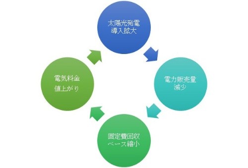 即,促進(jìn)自產(chǎn)自消的凈計量電價制度會增加分散型光伏發(fā)電系統(tǒng)的導(dǎo)入。隨著光伏發(fā)電的增加,電力公司的電力銷售總量會進(jìn)一步降低。能回收電價中包含的送配電網(wǎng)維護(hù)固定費(fèi)用的客戶基數(shù)縮少,因此電力公司會提高電價。隨著漲價,未設(shè)置光伏發(fā)電系統(tǒng)的電力用戶為了削減電費(fèi)會導(dǎo)入光伏發(fā)電系統(tǒng)。這樣,客戶群進(jìn)一步減少,電力公司又會再次漲價,如圖1。