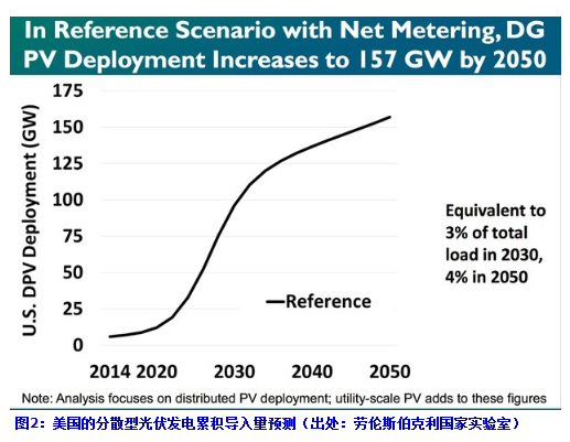 LBNL預(yù)測,如果繼續(xù)應(yīng)用現(xiàn)在的與零售電力為同等價格的凈計量電價制度,美國的分散型光伏發(fā)電市場(與配電網(wǎng)連接的住宅用及商業(yè)、公共、工業(yè)用系統(tǒng))2050年累計將擴(kuò)大至157GW。相當(dāng)于美國總電力需求的4%。并以該預(yù)測作為“參考值(reference)”,分析了“固定費(fèi)用回收(電價漲價)”和“按時段收費(fèi)”兩種制度(圖2)。