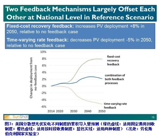 LBNL分析認(rèn)為,適用“固定費(fèi)用回收”制度時,2050年的光伏發(fā)電導(dǎo)入量與參考值相比會提高8%;而適用“按時段收費(fèi)”制度的話,則會比參考值減少5%(圖3)。