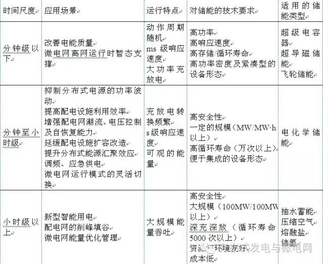 不同工況提出的儲(chǔ)能技術(shù)需求不同,應(yīng)結(jié)合儲(chǔ)能本體的技術(shù)特點(diǎn)進(jìn)行儲(chǔ)能選型。按照放電時(shí)間尺度劃分,儲(chǔ)能技術(shù)可分為功率型儲(chǔ)能和能量型儲(chǔ)能。功率型儲(chǔ)能適用于短時(shí)間內(nèi)對(duì)功率需求較高的場(chǎng)合,如微電網(wǎng)離網(wǎng)運(yùn)行時(shí)暫態(tài)支撐。能量型儲(chǔ)能適用于對(duì)能量需求較高的場(chǎng)合,如抑制分布式電源的功率波動(dòng)、提升分布式能源匯聚效應(yīng)等,見(jiàn)表1。