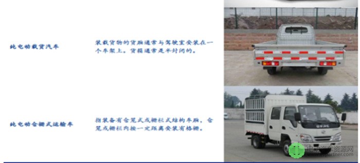 1)按照結(jié)構(gòu)可以分為:純電動廂(獨立、貫通)式運輸車、純電動(欄板四方桶)載貨汽車、純電動倉柵式運輸車等。