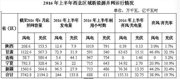 2016年上半年,西北五省(區(qū))新增光伏發(fā)電并網(wǎng)容量178.7萬千瓦,截至6月底,累計并網(wǎng)容量2194.2萬千瓦,占全網(wǎng)總裝機的11.0%。上半年,光伏發(fā)電量133.8億千瓦時,占全網(wǎng)總發(fā)電量的4.5%;利用小時數(shù)611小時,棄光電量32.8億千瓦時,棄光率19.7%。西北五省(區(qū))中,新疆、甘肅光伏發(fā)電運行較為困難,棄光率為32.4%和32.1%。此外,寧夏棄光率10.9%,青海棄光率3.2%,陜西首次發(fā)生棄光限電情況,棄光率為1.7%。