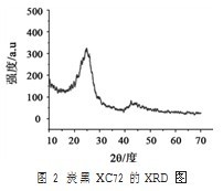 下圖是碳材料的掃描電鏡 (SEM ) 形貌圖。由圖可知,該炭黑具有微小球形顆粒,疏松多孔,其顆粒較小,在納米級范圍之內(nèi),團聚形成網(wǎng)絡(luò)結(jié) 構(gòu),通過 BET 測試可知其比表面積為 213 cm2/g,孔徑分布主要在 20~40 nm 間。圖 2 是碳材料的粉末 X 射線衍射(XRD )圖,從圖譜上可以看到在25°和45°分別出現(xiàn)兩個“饅頭”峰,這是碳材料的典型衍射峰,可知該種碳材料屬無定形結(jié)構(gòu)。